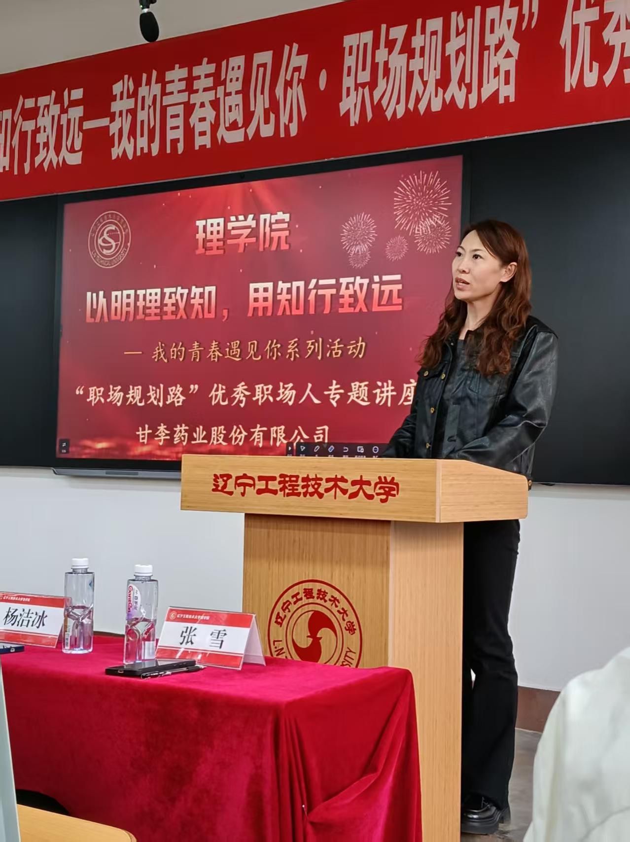 随后,李宁超经理向大家介绍了甘李药业有限公司的发展历程、卓越的业内成绩、人性化的员工管理体系,并着重介绍了公司的人才培养机制。同时从用人单位的角度,与全体学生分享了企业最需要什么样的人才,对学生如何充分利用在校的学习时光增长自身的知识和能力给出了建议。最后李经理现场与学生以互动的方式进行了深入的交流,就同学们如何能够在职场中修炼自身能力提出建议,鼓励大家要养成良好的生活习惯和学习习惯。她希望同学们能清晰自身定位,找寻能够提升自身能力,展现自身特色的职业平台。李经理代表甘李药业公司现场表示,辽宁工程技术大学生物工程专业的学生是公司招聘人才的目标院校,此次将在前期合作的基础上再次从生物工程专业2022级学生中遴选10名优秀学生到公司进行顶岗实习。