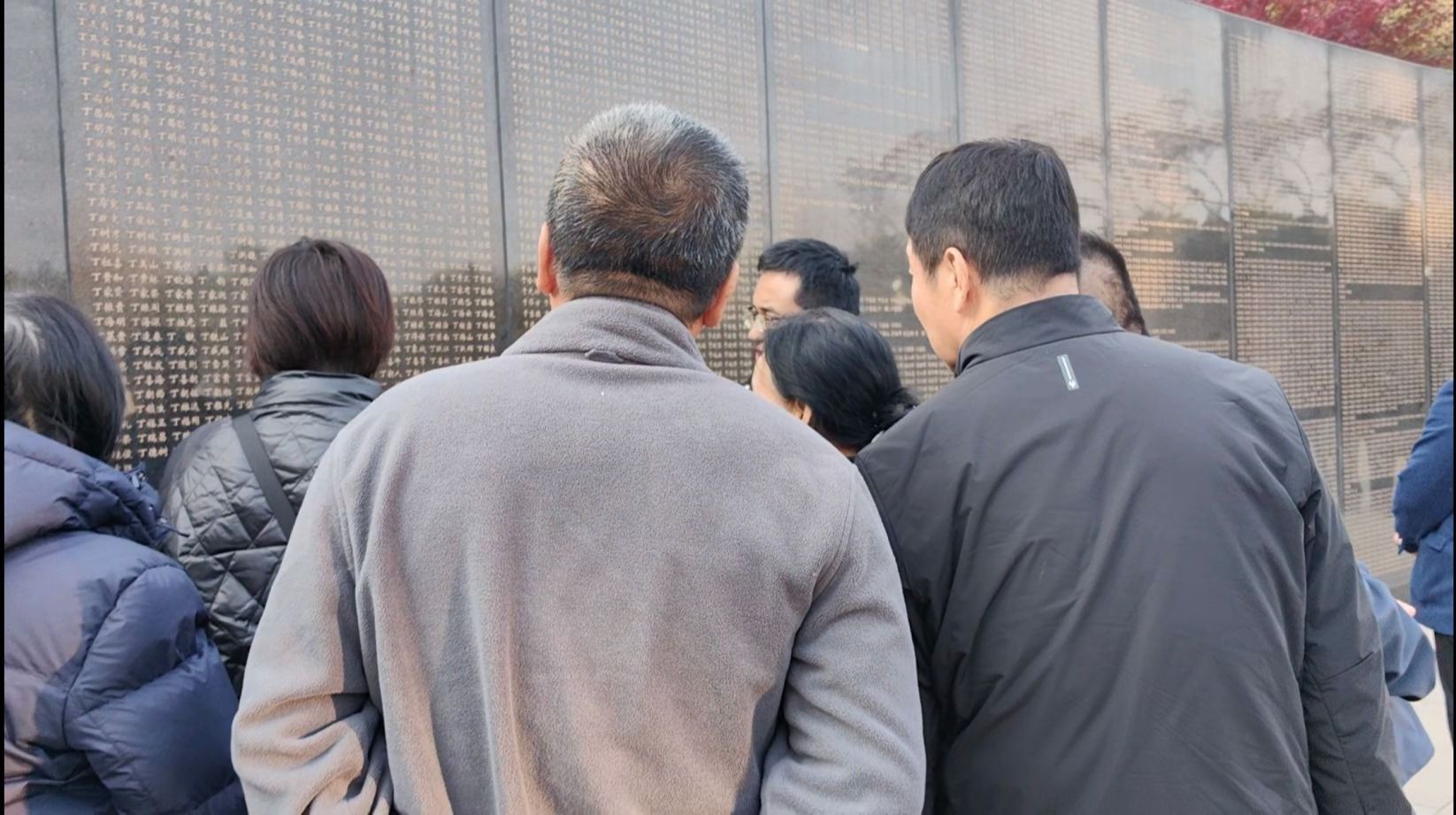 接下来,全体老师前往沈阳抗美援朝烈士陵园。纪念碑前,全体教师整齐列队,表情凝重,深深鞠躬,表达对英烈的深切缅怀与无限敬仰。绕过纪念碑,教师们来到环形烈士英名墙前,目光专注而虔诚地凝视着每一个名字。走进抗美援朝烈士纪念馆,馆内陈列着1000余件珍贵的革命文物、420余幅历史照片以及精心复原的战争场景,全方位、多角度地展现了抗美援朝战争的壮丽史诗。杨鑫院长在参观过程中补充道,抗美援朝战争中,先烈们用忠诚与奉献诠释了信仰的力量,而新时代的廉洁自律,正是这种信仰在和平年代的延续。全体老师要以革命先烈为榜样,把廉洁从政的要求融入日常工作,以过硬的作风为学院发展保驾护航。