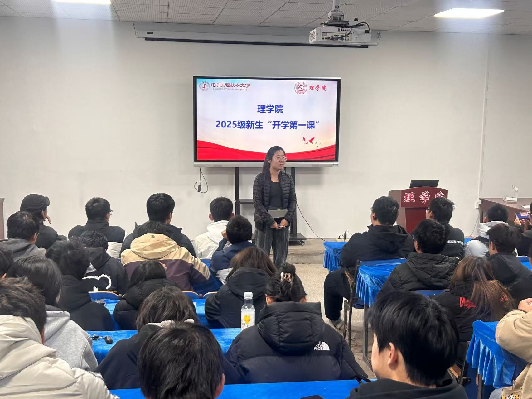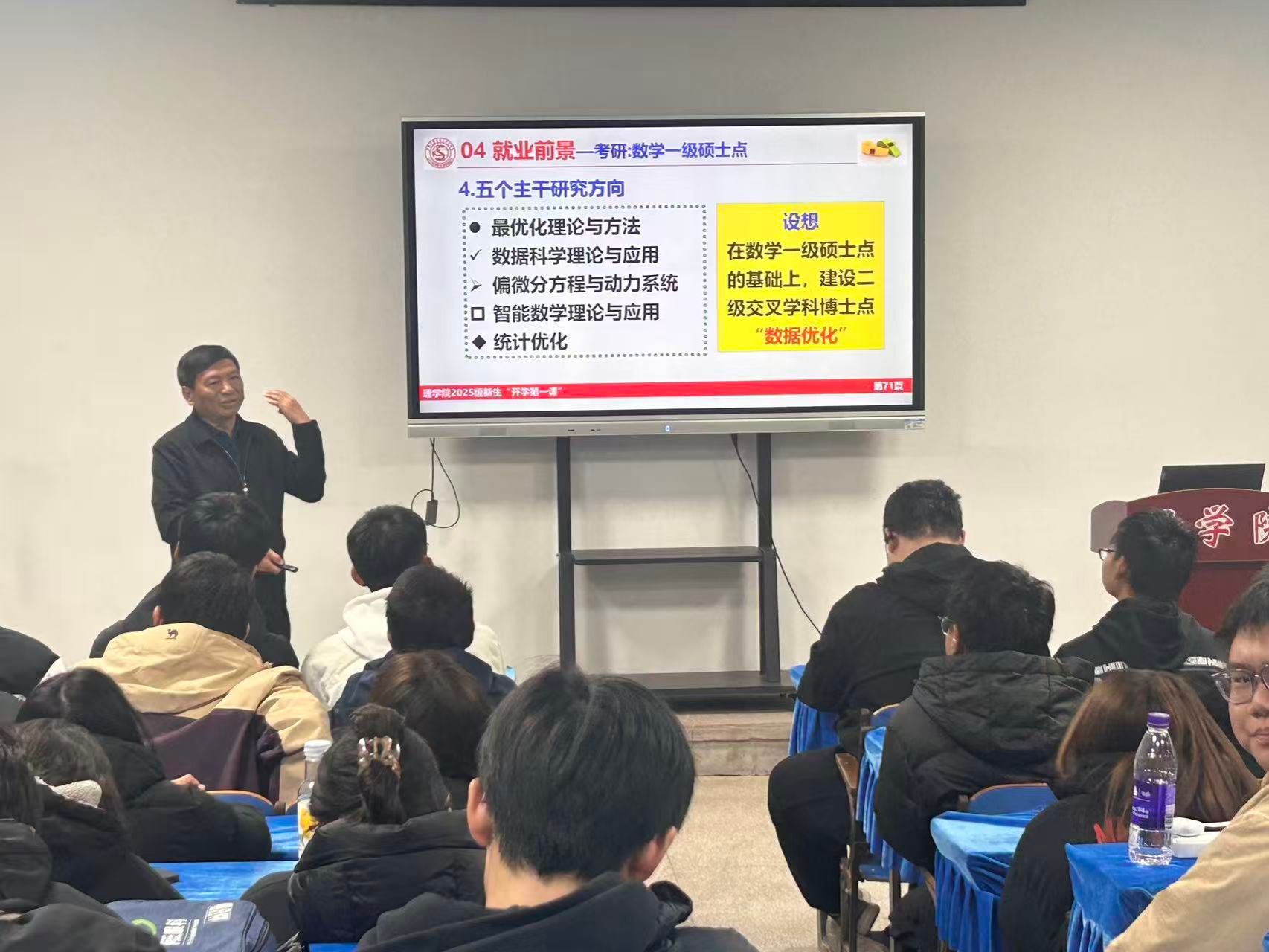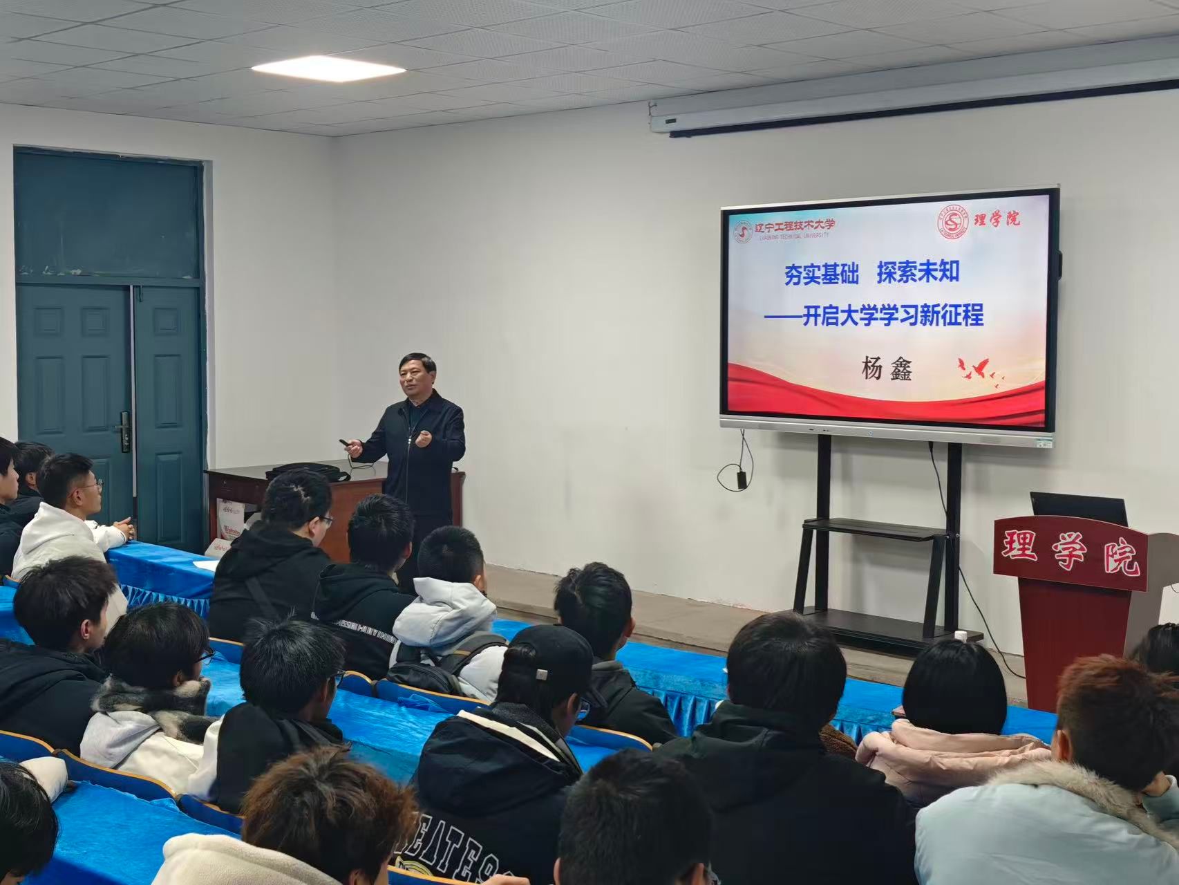 2025年10月末,理学院院长杨鑫在中和楼200会议室为2025级全体学生讲授了题为“夯实基础,探索未知——开启大学学习新征程”的“开学第一课”。旨在帮助新生全面了解学院历史、学科建设、人才培养及未来发展,引导同学们树立远大目标,科学规划大学生活。本次报告会由学院团委书记王胜楠主持。